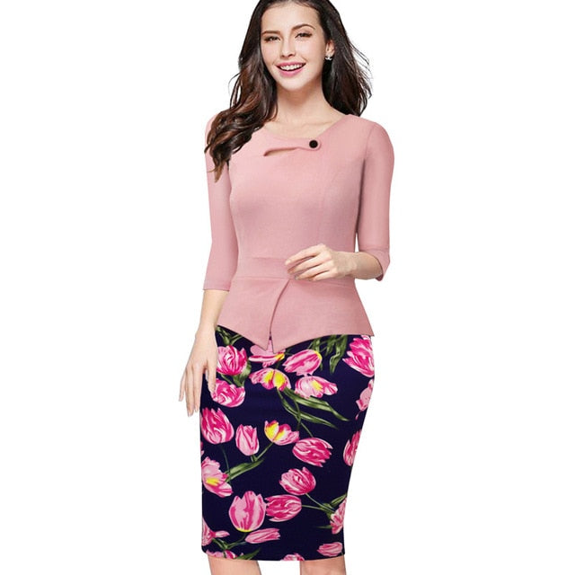 Nice-forever Autumn Print Floral Patchwork Button Casual Dress Business Three Quarter Zip Back Bodycon Summer Office Dress. Made with Spandex for stretching, Polyester for durability, Cotton Linen for softness.. Looking professional at the same time feeling comfortable in this soft breathable curve fitting Asymmetrical Neckline blouse and Knee-Length dress.